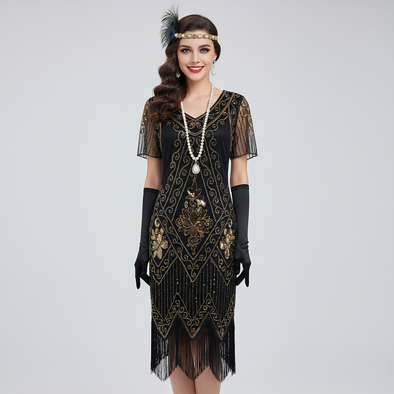 Retro Vintage Roaring 20s 1920s Knee Length Flapper Dress Outfits Accessories Set Short Sleeves The Great Gatsby Wedding Guest Sequins Tassel Fringe Sequin Tassel V Neck Fancy Dress Women's Carnival