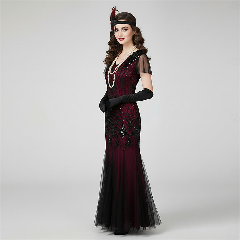 Set Retro Vintage Roaring 20s 1920s Floor Length Dress Outfits Cocktail Dress with Accessories Short Sleeves The Great Gatsby Wedding Guest Sequins V Neck Fancy Dress Women's Party Evening Wear