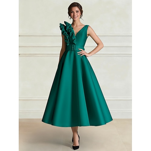 Linea ad A Lunghezza Tè Abito in Raso Vestito da Festa Abito da Cocktail Abito da cerimonia per signora Senza Maniche Scollo a V Elegante Formale Cocktail party Semi-Formale Raso con Fiore Tinta unita