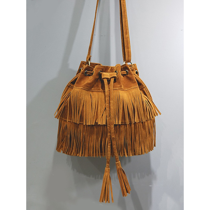 Women's Faux Suede Fringe Bucket Shoulder Bag – Bohemian Drawstring Crossbody Purse for Casual Outings, Festivals and Daily Wear