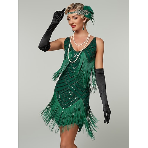 Anni Ruggenti Anni 1920 Lunghezza al ginocchio Abito Flapper Senza maniche Il grande Gatsby Paillettes Frange Scollo a V Costume Per donna Natale Carnevale Mascherata Festa a tema retrò Danza