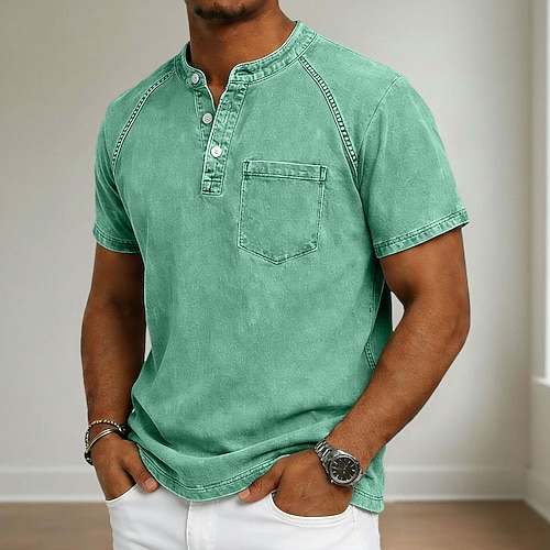 Da uomo Maglietta Maglia Henley Camicia 100% cotone lavaggio acido Manica Corta Collo alla coreana Henley Estate Primavera Autunno Semplice Vintage Streetwear Casual Lavato Manica corta Casuale Casa
