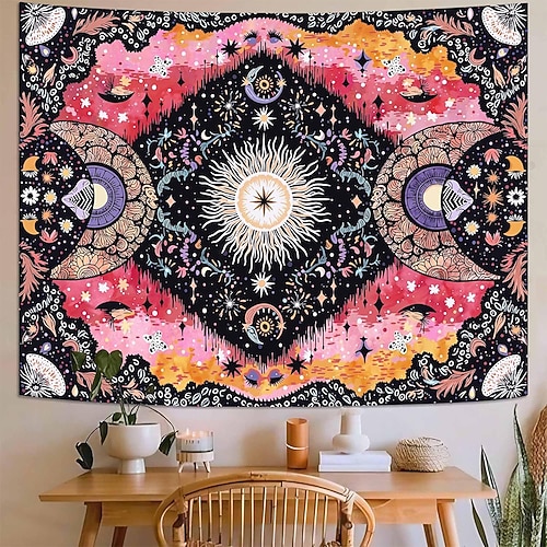 Arazzo da parete con volto di sole mistico e funghi, fasi lunari celestiali, felci botaniche di cristallo, estetica psichedelica, decorazioni per la casa, camera da letto, soggiorno, sfondo da