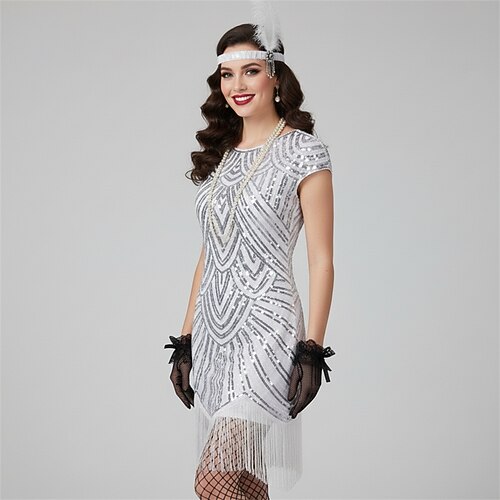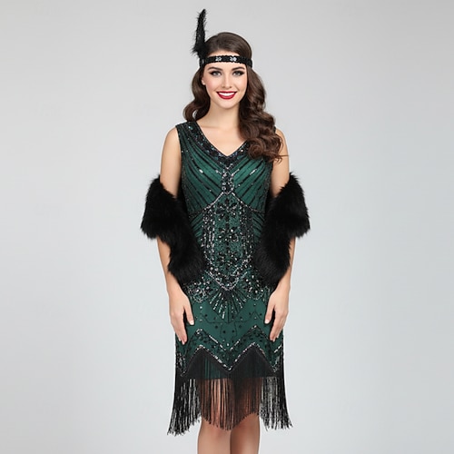 Set Retrò Vintage Anni Ruggenti Anni 1920 Abito Flapper Scialle in pelliccia sintetica con accessori Il grande Gatsby Ragazza Flapper Paillettes Frangia con nappe Costume Per donna Capodanno Cocktail