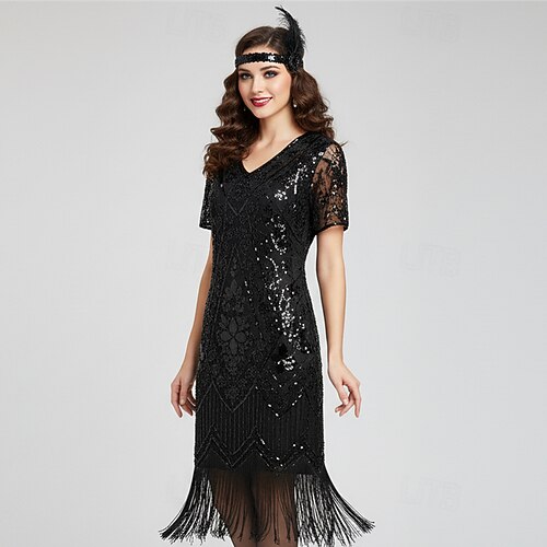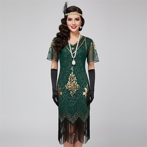 Anni 1920 Il grande Gatsby Lunghezza al ginocchio Abito Flapper Costume da festa Manica illusione Maniche corte Il grande Gatsby Frangia con nappe Paillettes Nappa Scollo a V Costume Per donna