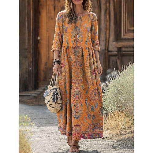Abito Maxi da Donna in Lino Stile Boho Elegante Abito Casuale da Spiaggia Fit Lungo Floreale Paisley Colore Blocco Manica 3/4 Collo Giro Blu Giallo Rosa Arancione Estate Primavera Autunno