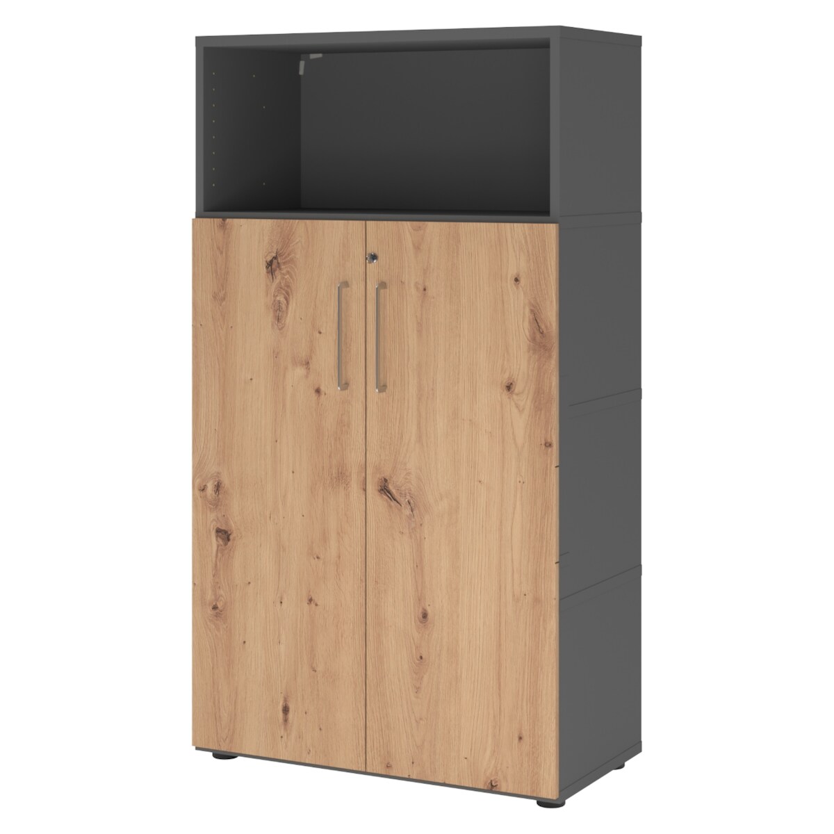 bümö flexi Aktenschrank abschließbar mit Flügeltüren & 1 Regalfach in Graphit/Asteiche, Büroschrank mit werkzeuglosem Schnellmontage-Klicksysten in