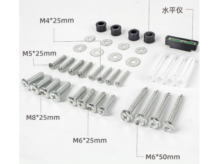 Skruekit til beslag - Waterpas, spacere, spændskiver, rawplugs med skruer til væg og M4, M5, M6 og M8 skruer til skærm