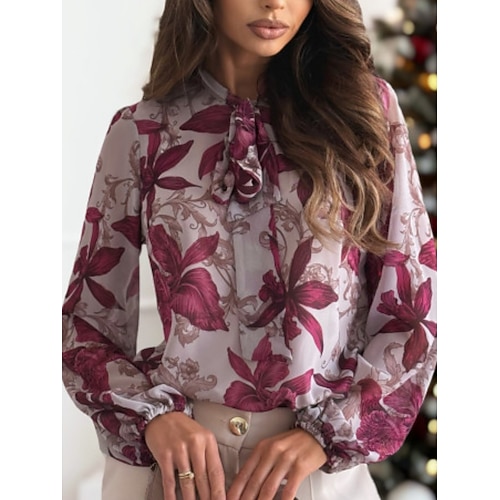 Per donna Camicia Blusa Floreale Informale Manica lunga A collo alto Top regolari Giornaliero Bottoni Stampa Nero Rosso Grigio Primavera Autunno