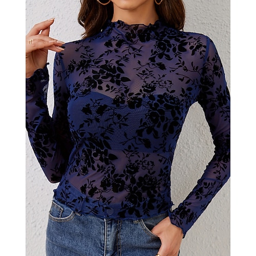 Per donna Blusa Floreale Elegante Manica Lunga Collo Alto Top Regolari Quotidiano Ferie Uscire Rete Nero Blu marino Estate Primavera