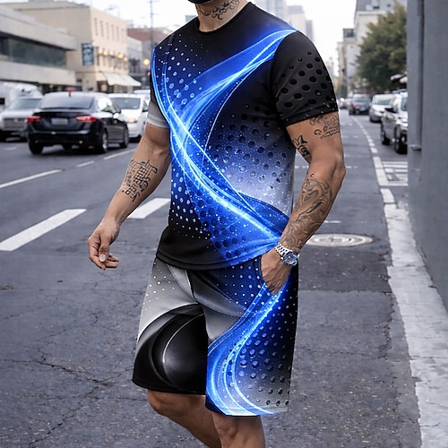 Herren Geometrisch 2St T-Shirts-Sets Sommeroberteile Kurzarm Kurze Hosen Rundhalsausschnitt Alltagstauglich Täglich Urlaub Sport 3D-Druck Sommer Blau Rote Grau
