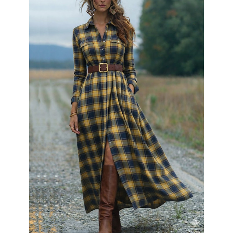 Women's Maxi Dress Shift Dress Vacation Casual Boho Daily Regular Fit Plaid Long Sleeve Lapel Yellow Red Green Spring Fall