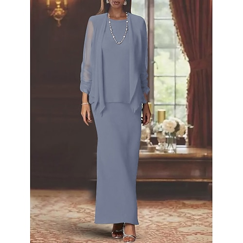 Due Pezzi Tubino Colonna Lunghezza al pavimento Abito da invitata a nozze Abito da cerimonia per signora Manica Lunga Scollo Tondo Elegante Formale Ospite di nozze Chiffon Con Stola con Tinta unita