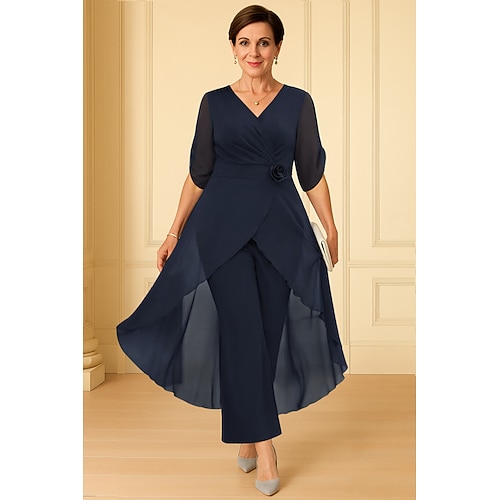 Tute Asimmetrico Abito da cerimonia per signora Mezza Manica Scollo a V Elegante Semplice Ospite di nozze Serata Formale Chiffon Tessuto Elasticizzato con Fiore Tinta unita