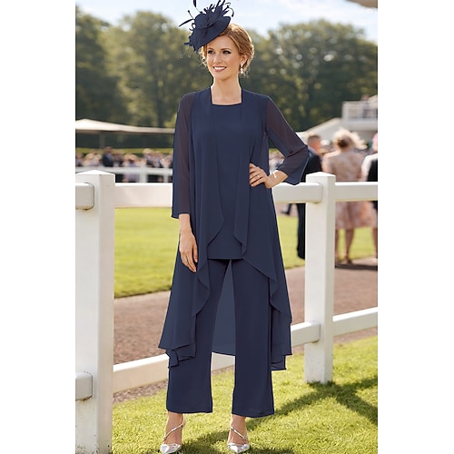 Tuta Completo Pantalone Tre Pezzi Lunghezza al pavimento Abito da cerimonia per signora Senza Maniche Scollo a Barca Elegante Taglie Forti Con Stola Ospite di nozze Chiffon Abiti con Giacca con Tinta