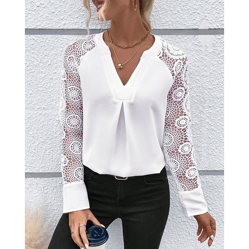 Women's Blouse Lace Tops Solid Color Vintage Stylish Casual Long Sleeve V Neck Regular Tops Daily Holiday Patchwork White Spring Fall