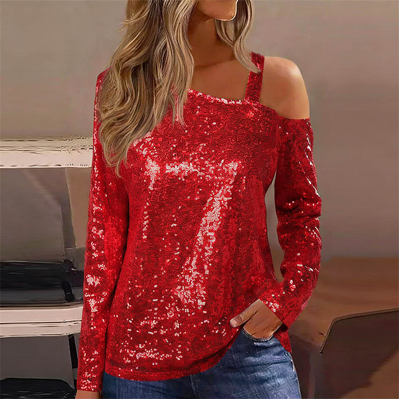 Women's Blouse Dressy Tops Sequin Tops Solid Color Plain Elegant Vintage Stylish Long Sleeve Asymmetrical Regular Tops Daily Work Going out Ruched Sequins Patchwork Blue Black White Red Purple Spring
