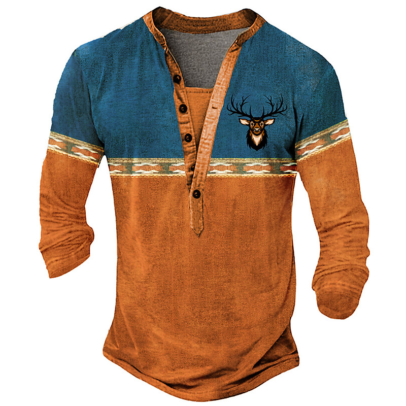Men's Letter Print Deer Henley Shirt Long Sleeve 3D Print Cowboy Casual Holiday Going out Summer Spring Fall Black Navy Blue Army Green Henley Henley T-Shirt