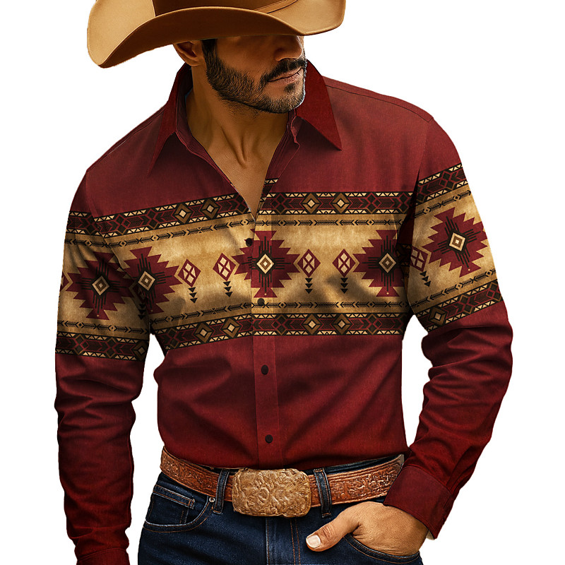 Men's Geometric Aztec Ethnic Shirt Western Shirt Cowboy Shirt Long Sleeve Vintage Retro Outdoor Camping Hiking Hunting Spring Fall Turndown 3D Print Button Up Shirts White Burgundy Green