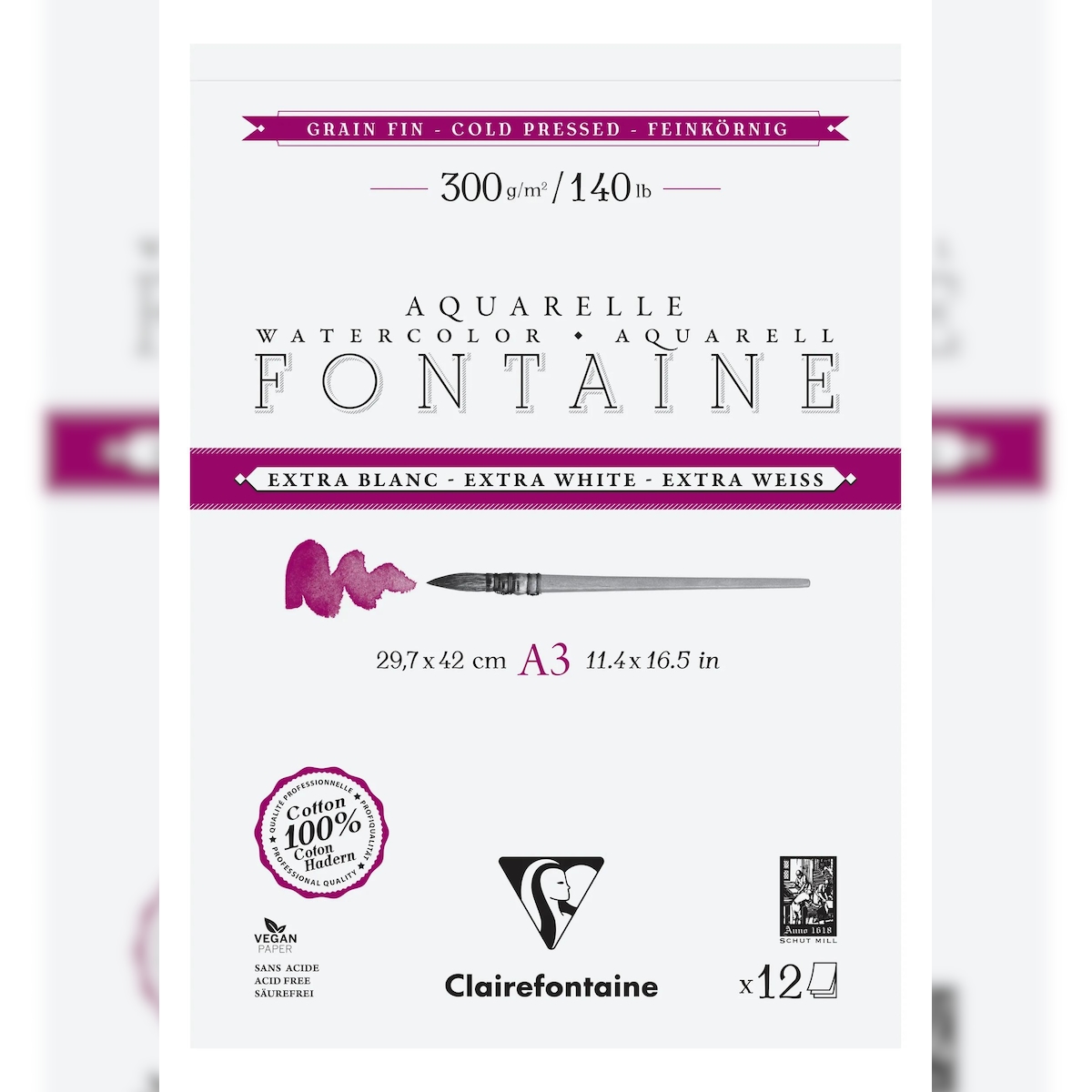 Clairefontaine 5x Fontaine, Aquarellpapier extraweiß feinkörnig, Block 2-seitig geleimt, 12 Bogen A3 300g - 976048C