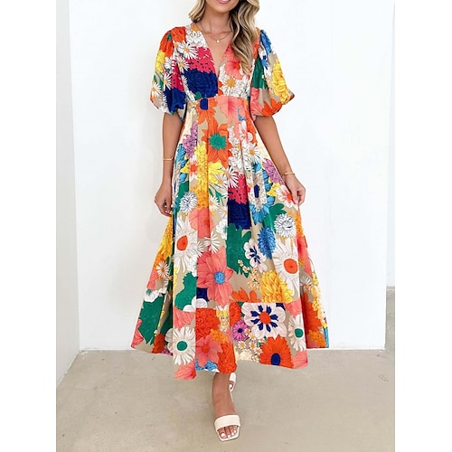 Per donna Abito maxi Abito a trapezio Casual All'aperto Uscire Vestibilità comoda Floreale Grafico Mezza Manica Scollo a V Blu Rosa Arcobaleno Estate Primavera