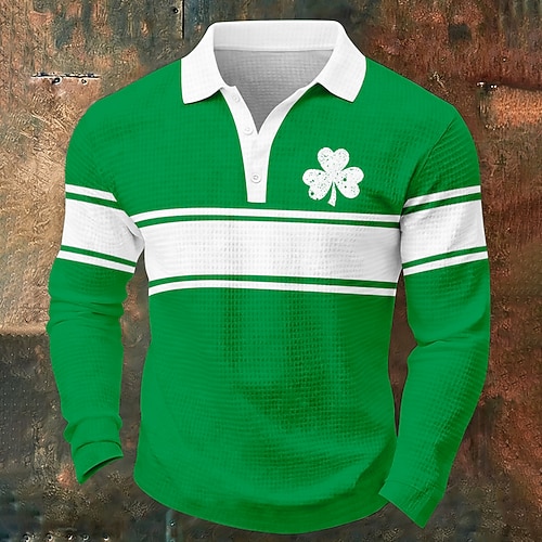 Giorno di San Patrizio Per uomo Trifoglio Magliette Polo a Nido d'Ape Manica Lunga Magliette polo Camicie con Colletto Casual Abbigliamento quotidiano Abito da festa Bottoni Primavera Autunno Bianco