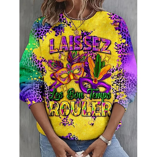 Felpa Pullover da Donna Carnival Maglietta Grafica Geometrica Casual Maniche Lunghe Collo Giro Collo Regolare Tops Moda Quotidiana Giallo Viola Primavera Autunno Inverno