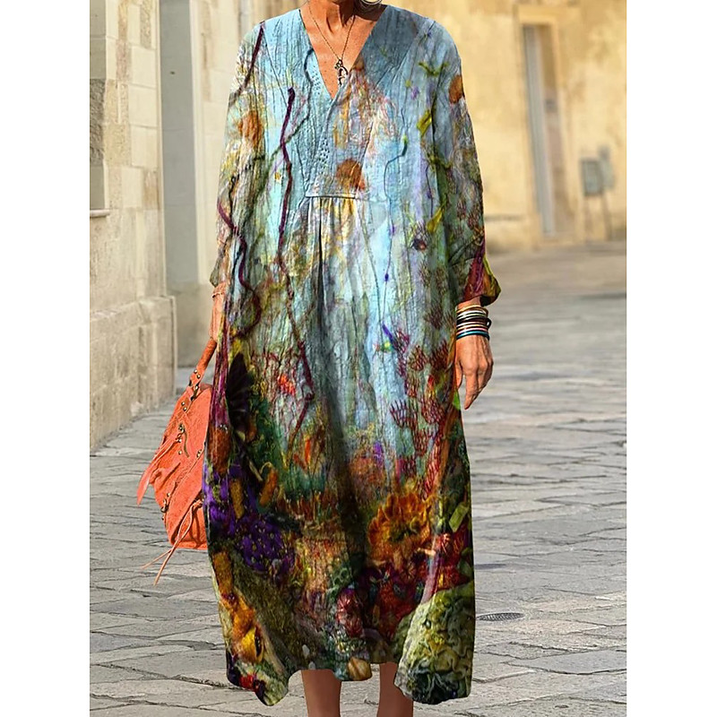 Women's Midi Dress Sundress A Line Dress Vacation Casual Boho Going out Beach Loose Fit Graphic Geometric Long Sleeve V Neck Purple Orange Green Spring Fall Winter Autumn