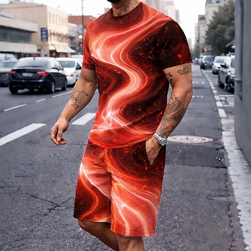Herren Geometrisch 2St T-Shirts-Sets Sommeroberteile Kurzarm Kurze Hosen Rundhalsausschnitt Lässig Täglich Urlaub Ausgehen 3D-Druck Sommer Blau Rote Grau