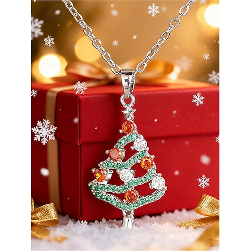 Halskette mit Weihnachtsbaumanhänger für Damen mit grüner und roter Strassverzierung, Weihnachtsschmuckgeschenk