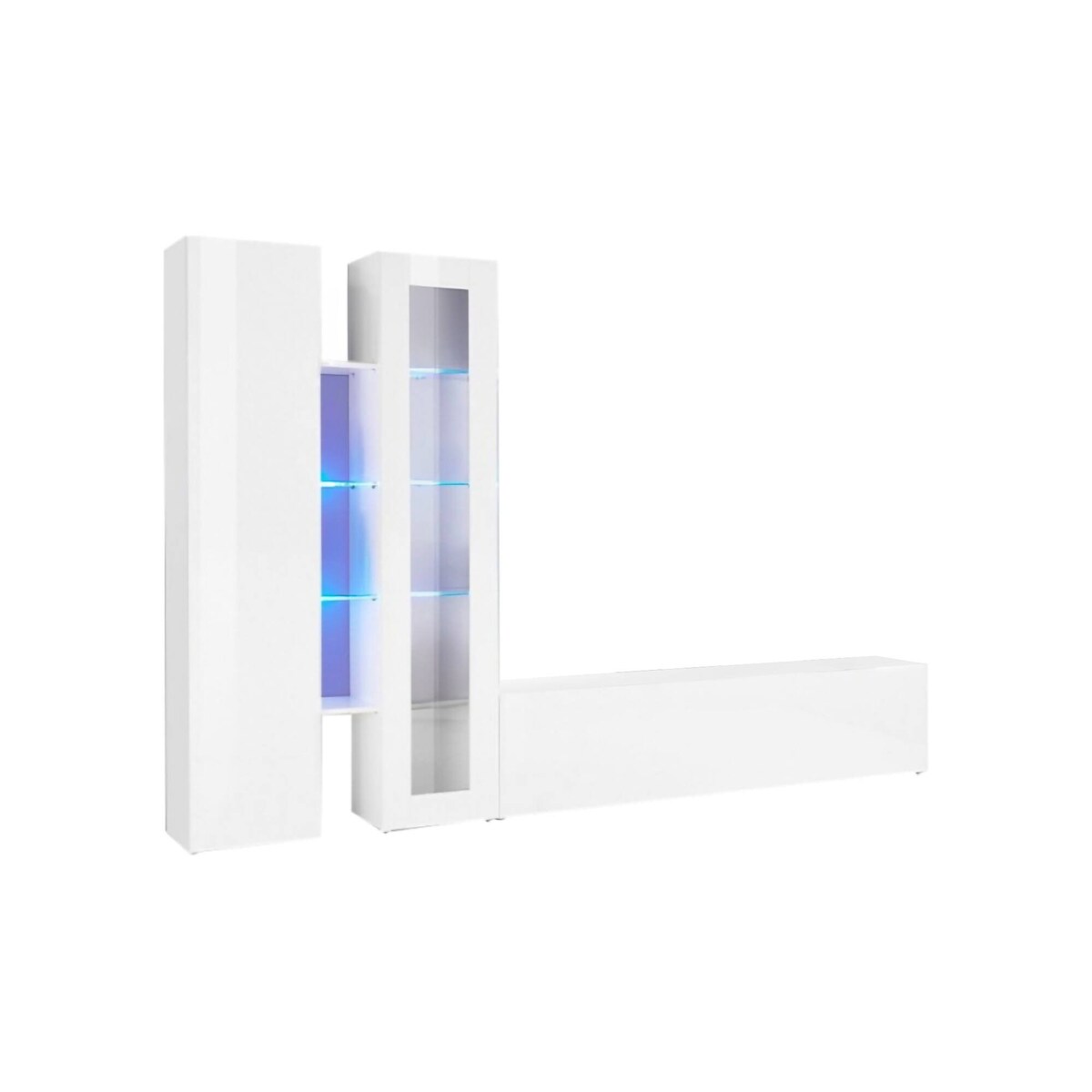 Dmora Wohnzimmermöbel Dimitri, Wohnzimmer-Set TV-Möbel mit 3 Türen, Mehrzweck-Wohnmöbel mit Vitrine und LED-Licht, cm 280x30h180, glänzend weiß