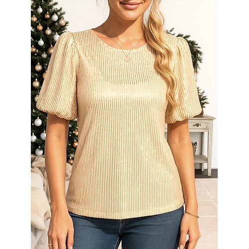 Per donna Blusa Tinta unica Elegante Casual Manica Corta Girocollo Top Regolari Quotidiano Arricciato Bottoni Oro Primavera Autunno Inverno