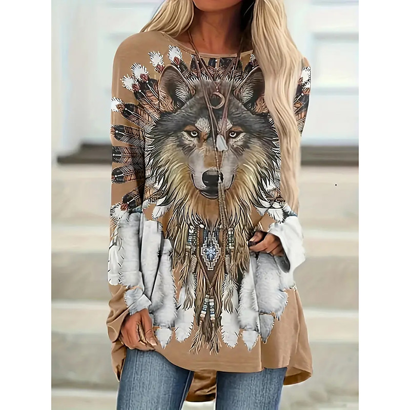 Women's T Shirt Graphic Animal Tribal Vintage Stylish Classic Long Sleeve Crew Neck Round Neck Long Tops Daily Print Black Brown Khaki Spring Fall