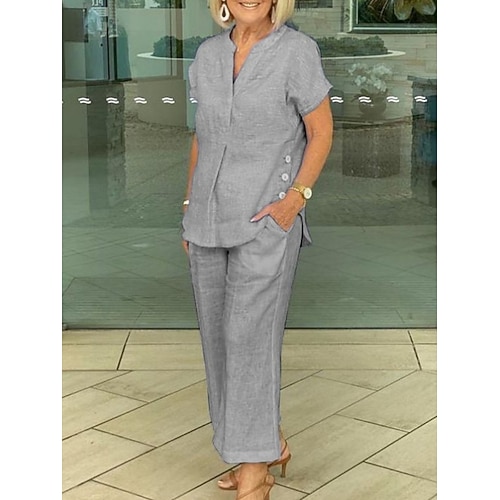 Per donna Attivo Moda Camicie di cotone e lino Set di biancheria in cotone Blusa Manica Corta Colletto a Camicia Tinta unica Dubbele Rij Knopen Uscire Weekend Nero Bianco Blu Estate Vestibilit