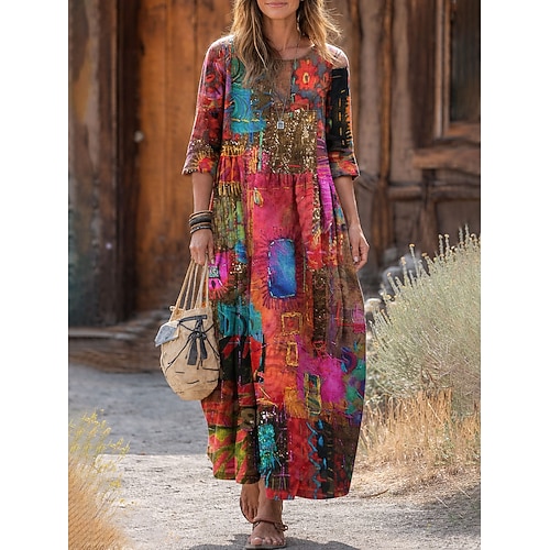 Abito Maxi da Donna in Lino Stile Boho Elegante Abito Casuale da Spiaggia Fit Lungo Floreale Paisley Colore Blocco Manica 3/4 Collo Giro Blu Giallo Rosa Arancione Estate Primavera Autunno