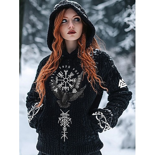maglione vintage vichingo da donna, stile etnico quotidiano, grafico, con cappuccio, manica lunga, top regolari, lavorato a maglia, quotidiano, festa, nero, primavera, autunno