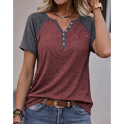 Per donna Maglietta Blocco di colore Bottoni Vintage Elegante Casual Manica Corta Scollo a V Top Regolari Quotidiano Uscire Nero Vino Estate Primavera