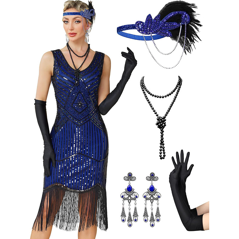 Set with Midi Flapper Dress Feather Headband Faux Fur Shawl Necklace Earings Long Opera Gloves Women's Roaring 20s 1920s Outfits Flapper Girl Cocktail Masquerade Party Carnival Sequin Costumes
