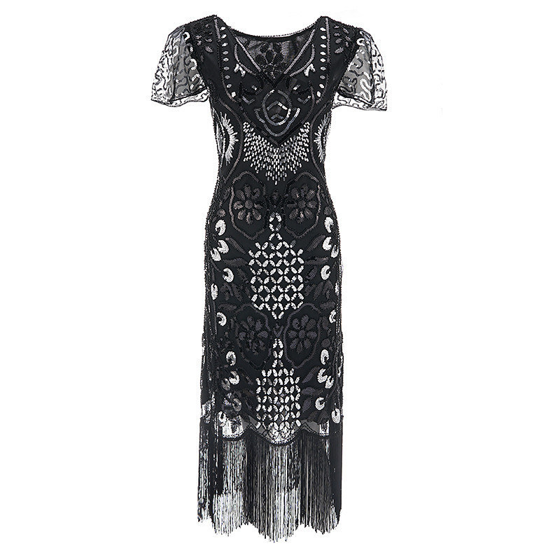 Retro Vintage Roaring 20s 1920s Midi Flapper Dress Dress Short Sleeves The Great Gatsby Wedding Guest Sequins Tassel Fringe V Neck Fancy Dress Women's Masquerade Wedding Party / Evening Evening Party