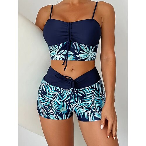 Costume da bagno a tankini da donna 2 pezzi pantaloni corti arricciati palme controllo dell'addome vita alta slim schiena scoperta per vacanze al mare foglie collo a V senza maniche costumi da bagno