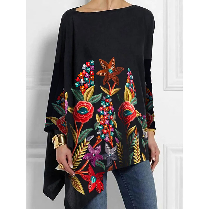 Women's Blouse Long Sleeve Tunic Tops Floral Fashion Off Shoulder Regular Tops Holiday Weekend Print Asymmetrical Black Yellow Red Spring Fall