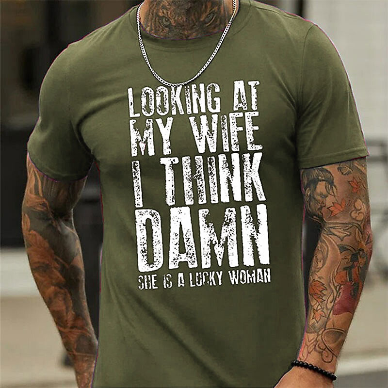Men's Funny Graphic T-Shirt Short Sleeve, Husband Wife Marriage Quote: 'Looking At My Wife I Think Damn She Is A Lucky Woman'