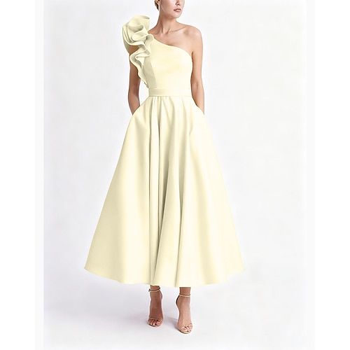 Linea ad A Lunghezza alla caviglia Abiti da Cocktail Abiti da festa Elegante Senza Maniche Monospalla Ospite di nozze Abbigliamento da Festa Tasca Raso con Volant