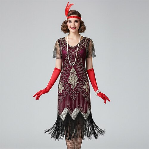 Retrò Vintage Anni Ruggenti Anni 1920 Lunghezza al ginocchio Abito Flapper Vestito Abiti Maniche corte Il grande Gatsby Invitato al matrimonio Paillettes Frangia con nappe Scollo a V Costume Per donna