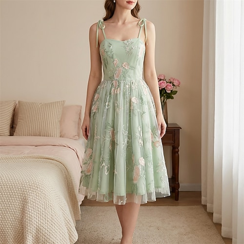 Elegante Vintage Anni 1950 Midi Vestito Canotta Ricamato Floreale Linea ad A Aderente Svasato Collo a cuore Costume Per donna Casuale Tè Adulti Vestito Primavera Estate