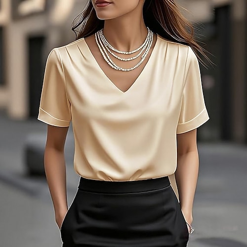 Per donna Camicia Tinta unica Elegante Bohemien Vintage Manica Corta Scollo a V Top Regolari Quotidiano Nero Bianco Rosso Beige Estate