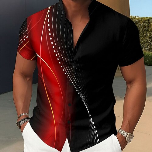 Herren Geometrisch Farbverlauf Linie Hemd Knopfhemd Stehkragenhemd Kurzarm Vintage-Retro Urlaub Alltagskleidung Strandbekleidung Sommer Frühling Mandarinkragen 3D-Druck Leinenähnliches Hemd Blau Rote