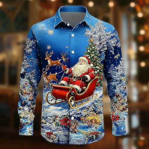 Weihnachten Herren Weihnachtsmann Schneeflocke Schlitten Hemd Knopfhemd Langarm Lustig Weihnachtsgeschenke Ferien Frühling Herbst Umlegekragen 3D-Druck Hemden mit Kragen Blau 1# Rote Blau