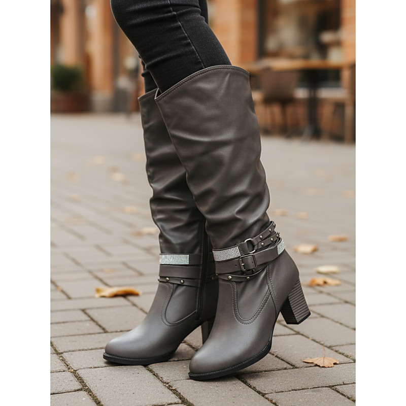 Women's Knee-High Boots with Buckle Straps and Slouchy Design, Featuring Mid-Heel and Versatile Style for Casual and Evening Wear