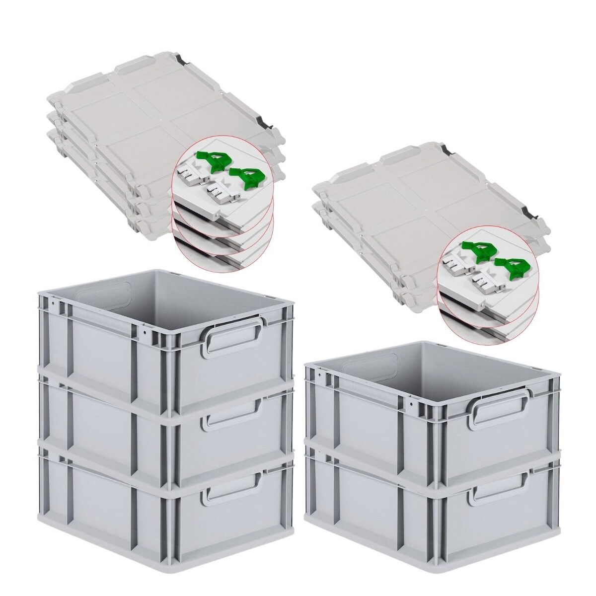 PROREGAL 5x Eurobox NextGen Grip mit Scharnierdeckel & grünen Verschlüssen | HxBxT 17x30x40cm | 16 Liter | Griffe geschlossen | Glatter Boden
